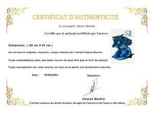 Cette œuvre de l’artiste se distingue par son jeu de formes organiques et son utilisation audacieuse des tons bleus et turquoise, contrastés par des lignes noires épaisses. La composition semble évoquer une créature marine ou une structure cellulaire stylisée, conférant une impression de fluidité et de mouvement. Les croix noires à l’intérieur de certaines formes renforcent une dimension graphique intrigante, ajoutant une symbolique mystérieuse. L’ensemble dégage une énergie à la fois apaisante et dynamique, où la complexité des motifs structure l’espace de manière harmonieuse.