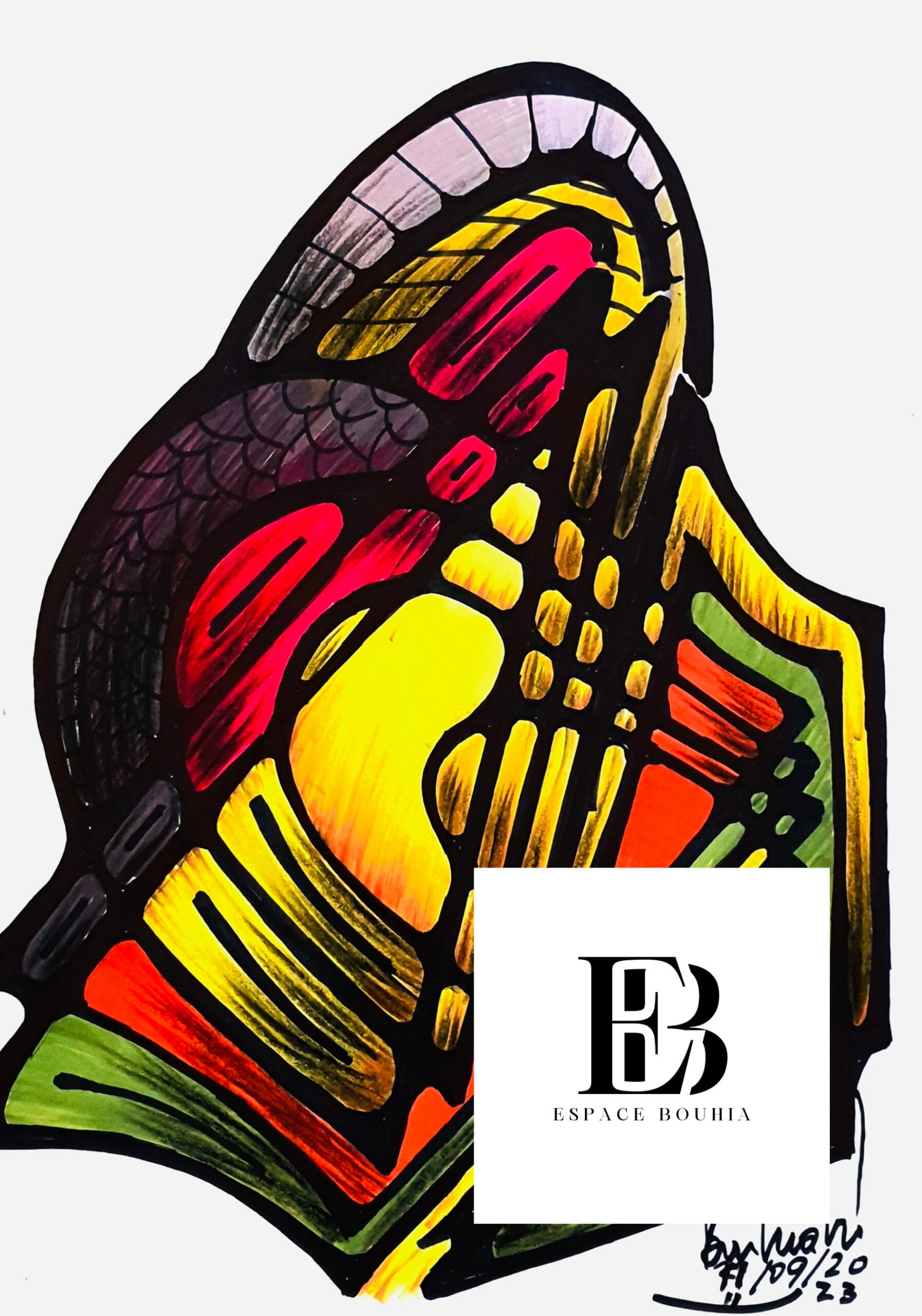 L’énergie vibrante de cette composition capte immédiatement le regard. Les contrastes de couleurs intenses, entre le rouge ardent, le jaune lumineux et le vert profond, créent une dynamique presque musicale. Les formes imbriquées semblent entrelacées dans un mouvement organique, évoquant une métamorphose en cours. L’influence de la nature et des textures reptiliennes se devine dans les motifs écailleux qui traversent la toile. Chaque trait noir accentue la structure et guide l’œil dans un voyage hypnotique. L’œuvre oscille entre abstraction et suggestion figurative, laissant libre cours à l’imagination. Le jeu de lumière et d’ombre renforce la profondeur et donne du relief à l’ensemble. Il en résulte une sensation d’équilibre entre chaos et harmonie. Une création puissante qui interpelle et invite à une contemplation prolongée.